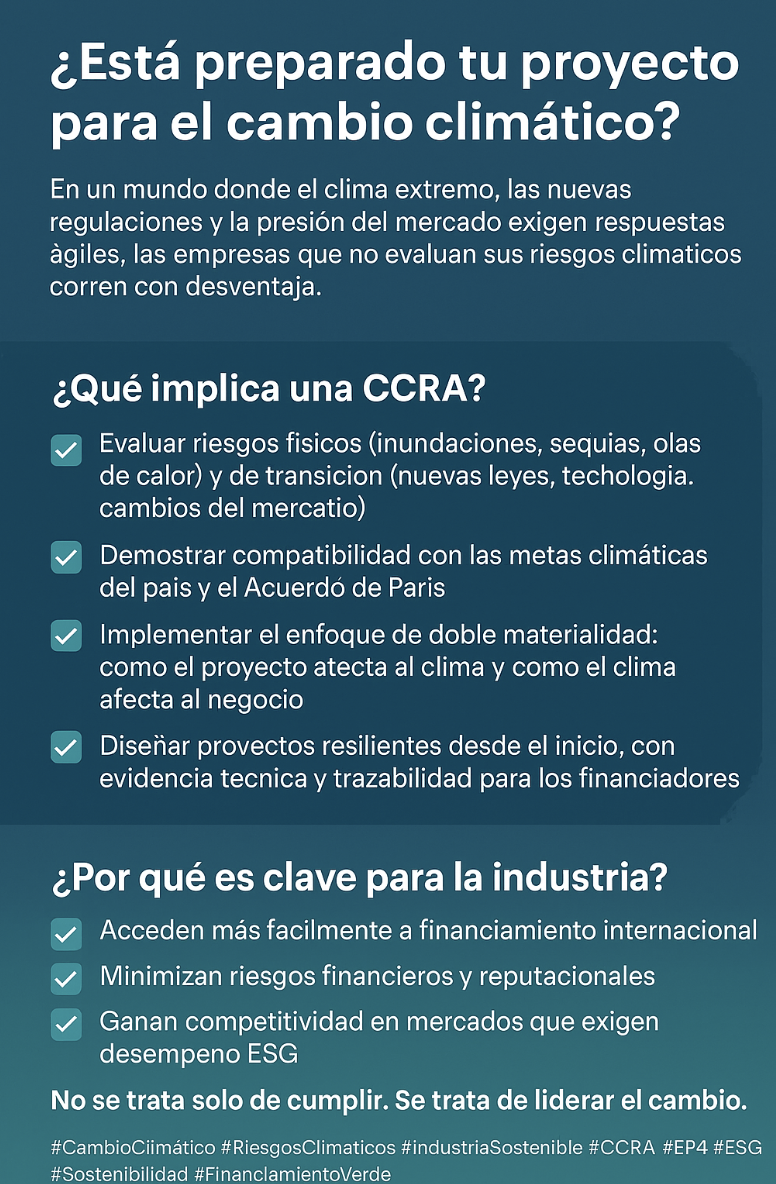 #CambioClimático #RiesgosClimáticos #IndustriaSostenible #CCRA #EP4 #ESG #Sostenibilidad #FinanciamientoVerde #IngenieríaSostenible #TransiciónEnergética #ClimateRisk #DueDiligenceAmbiental #TCFD