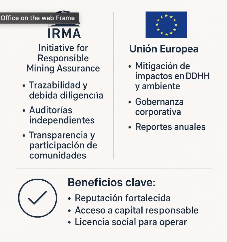 Hoy, alinearse a marcos como IRMA (Initiative for Responsible Mining Assurance) y a las regulaciones emergentes de la Unión Europea (UE) no es solo una buena práctica: se ha convertido en un requisito para acceder a mercados clave y asegurar la viabilidad a largo plazo.