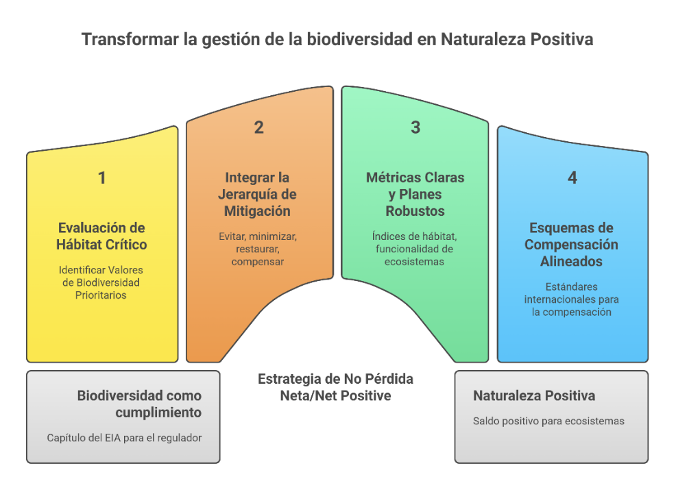 El punto de partida es una Evaluación de Hábitat Crítico y la identificación de Valores de Biodiversidad Prioritarios. A partir de allí, la jerarquía de mitigación (evitar, minimizar, restaurar, compensar) debe integrarse en el diseño del proyecto, no aplicarse a posteriori para justificar decisiones ya tomadas.