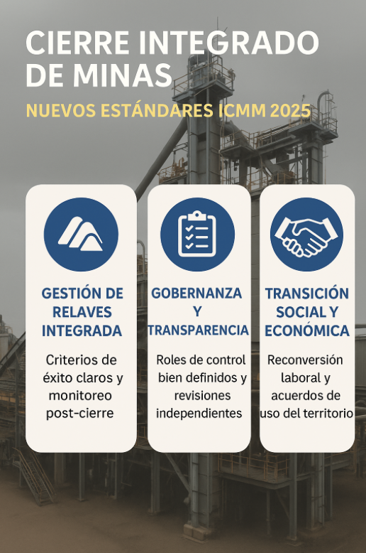 El cierre de minas dejó de ser un trámite al final del ciclo de vida y se transformó en un proceso estratégico. La edición 2025 del ICMM eleva las expectativas: exige gobernanza sólida, provisiones financieras reales, integración de relaves, transición socioeconómica y participación activa de las comunidades.