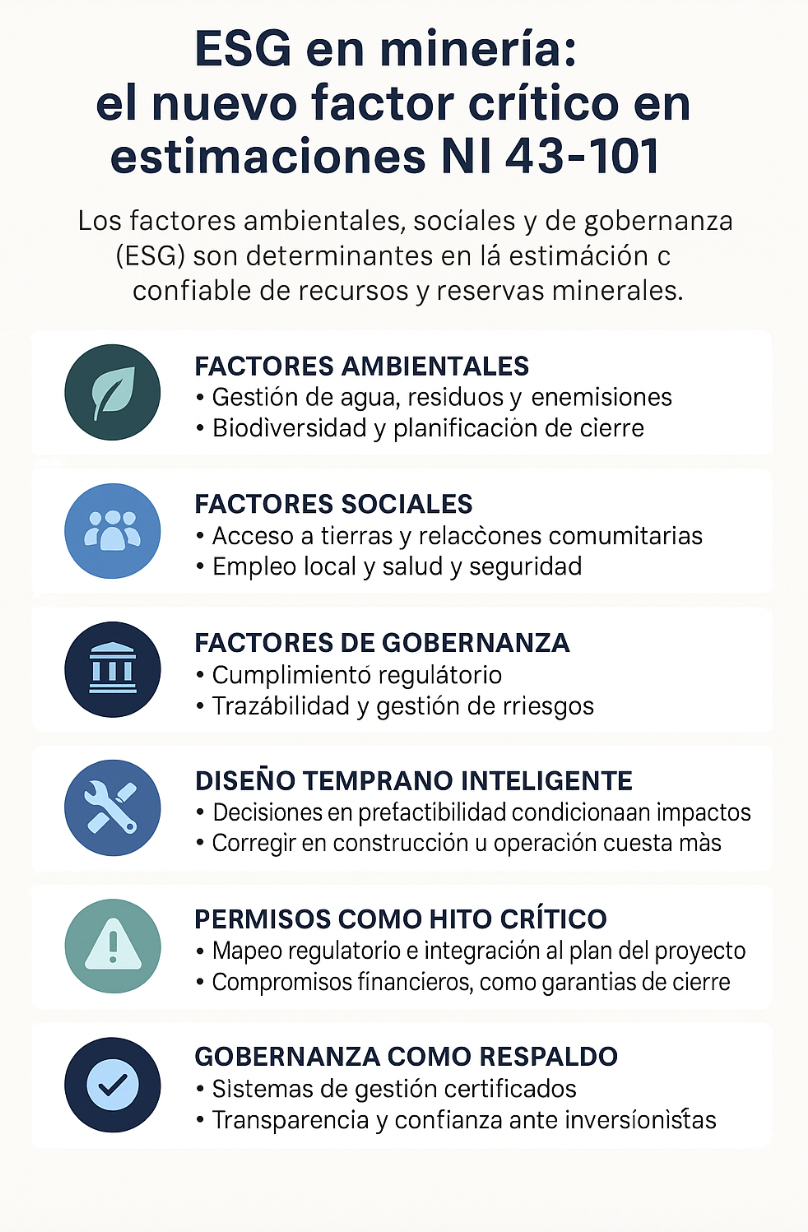 Las compañías que internalizan estas guías no solo aseguran cumplimiento, sino que también ganan en acceso a financiamiento, confianza de comunidades e inversores, y reducen contingencias futuras. En un mercado donde el tiempo hasta la producción define retornos, integrar ESG en estimaciones NI 43-101 deja de ser “mejor práctica” para convertirse en requisito estratégico.