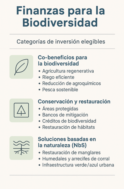 La Guía de Referencia de Finanzas para la Biodiversidad (IFC, 2023) brinda una taxonomía concreta de actividades elegibles, agrupadas en tres categorías principales: