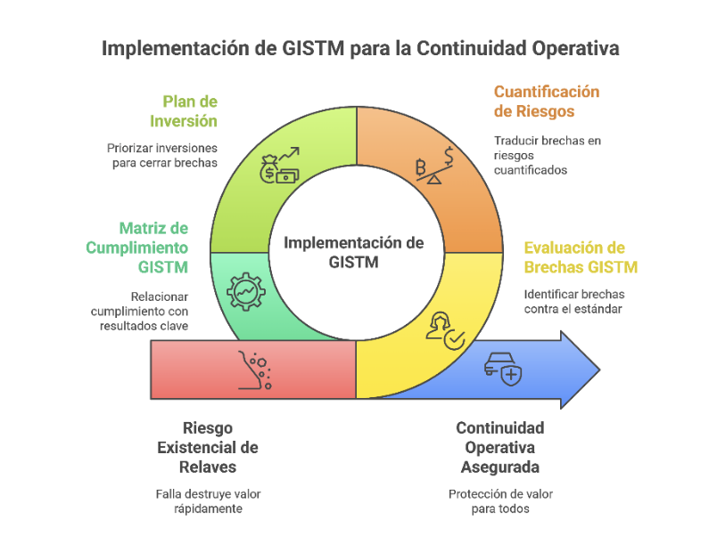 Un enfoque serio parte por una evaluación de brechas GISTM: gobernanza y rol del Accountable Executive, estructura de responsabilidades, calidad de los estudios geotécnicos e hidrológicos, gestión del agua en el TSF, diseño para sismos máximos creíbles, planes de emergencia y participación de las comunidades potencialmente afectadas. Cada brecha debe traducirse en un riesgo cuantificado (probabilidad x consecuencia) y en un plan de inversión con hitos y prioridades claras.