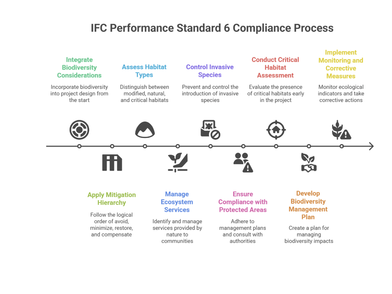 El corazón del estándar es la Mitigación Jerárquica. Es un orden lógico que no admite atajos: primero se evita, luego se minimiza, después se restaura y solo al final, cuando no existe otra alternativa técnica real, se compensa. Esto significa que los proyectos ya no pueden tratar a la biodiversidad como una variable post-diseño: deben incorporarla desde la selección del sitio, el layout preliminar y la definición de alternativas.