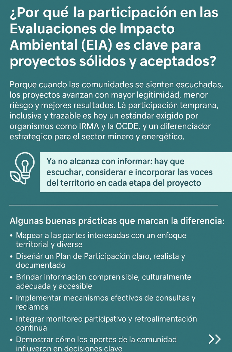 #Sostenibilidad #EIA #IRMA #OCDE #MineríaResponsable #ConsultaComunitaria #ParticipaciónCiudadana #LicenciaSocial #DesarrolloSostenible #ESG #EvaluaciónAmbiental